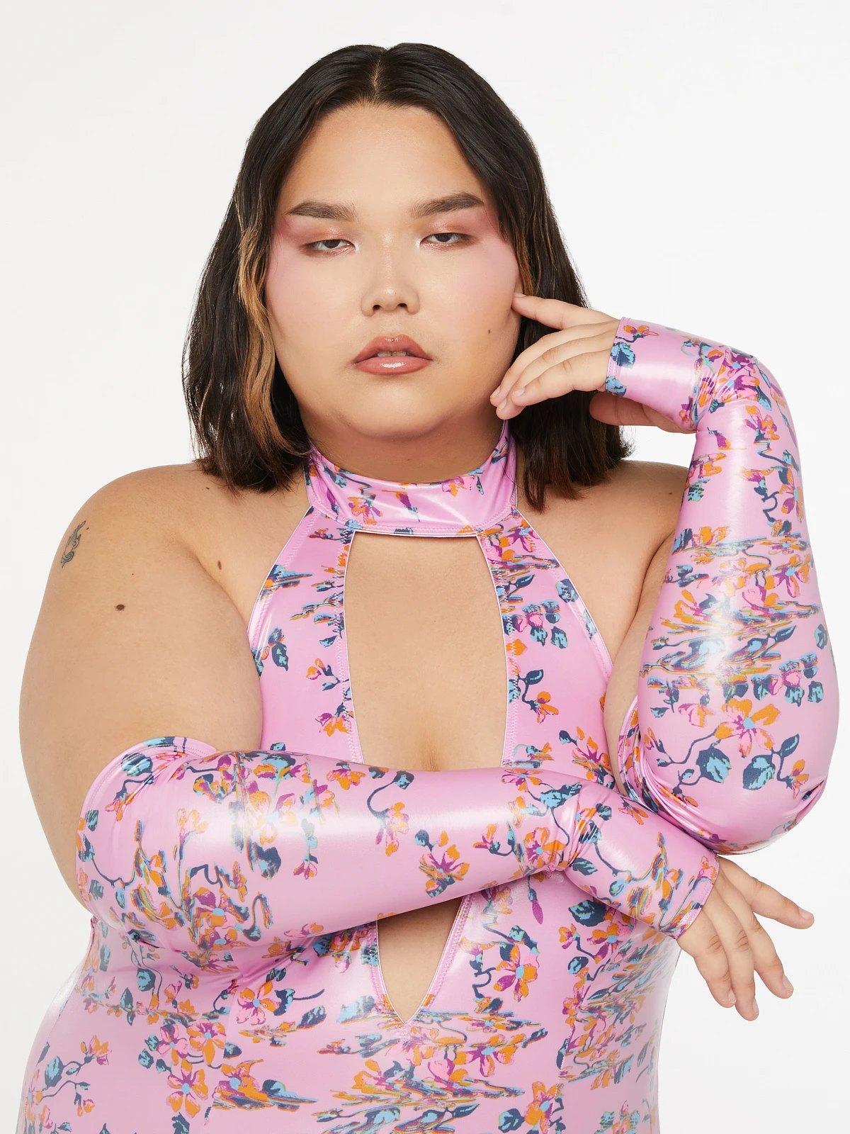 Our Arm Candy Fingerless Vinyl Gloves feature an allover custom floral print and fingerless design.