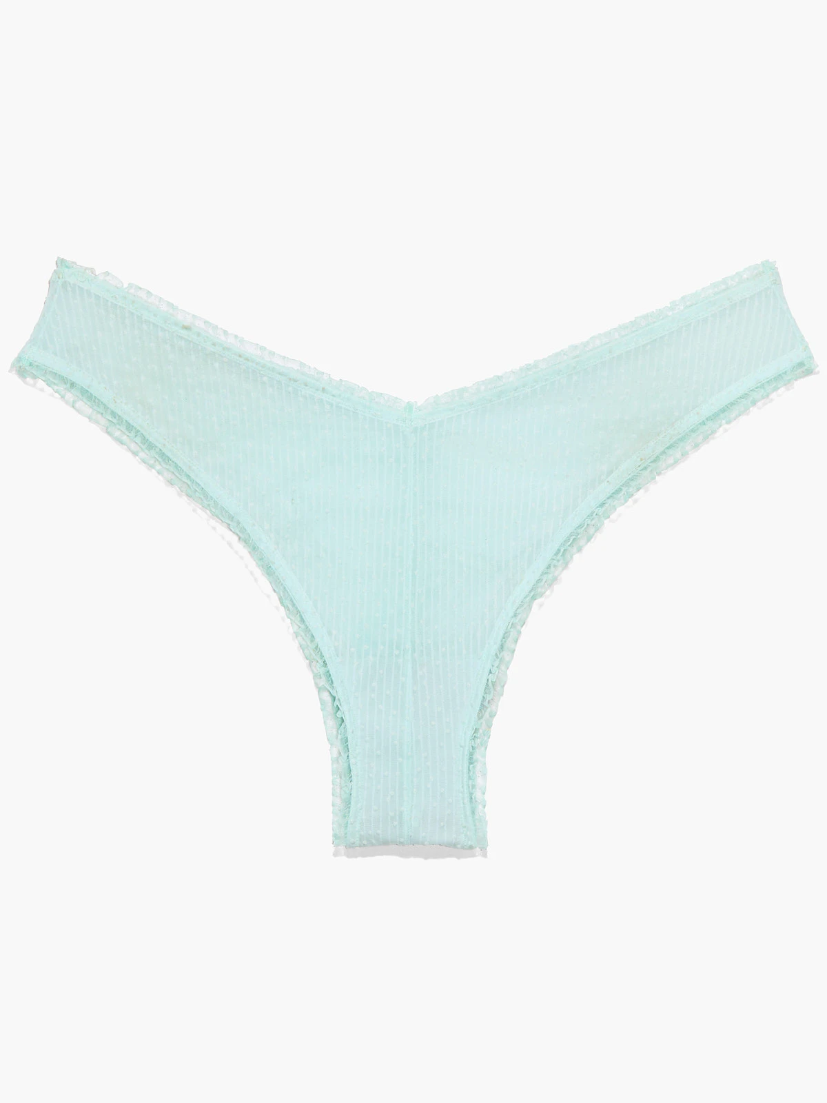 Our Back to the Boudoir Brazilian is a futuristic fantasy. This style mixes striped mesh, flocked polka dots and offers ruffle detail at the leg lines.