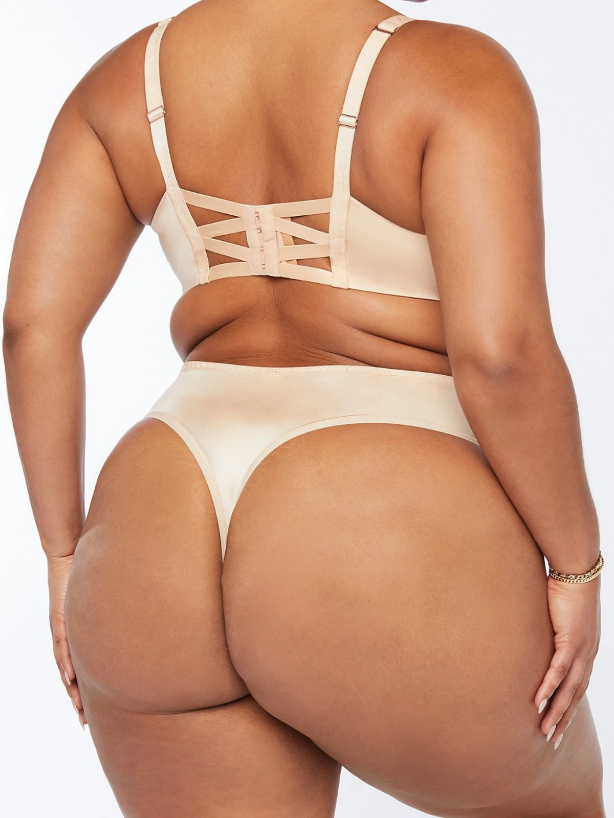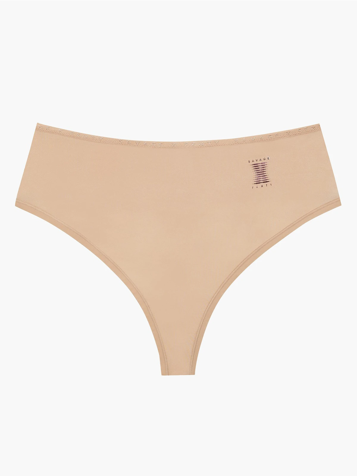 This high-waist thong is made of high shine microfiber and features an extremely reflective rose gold tone X graphic on the left hip.