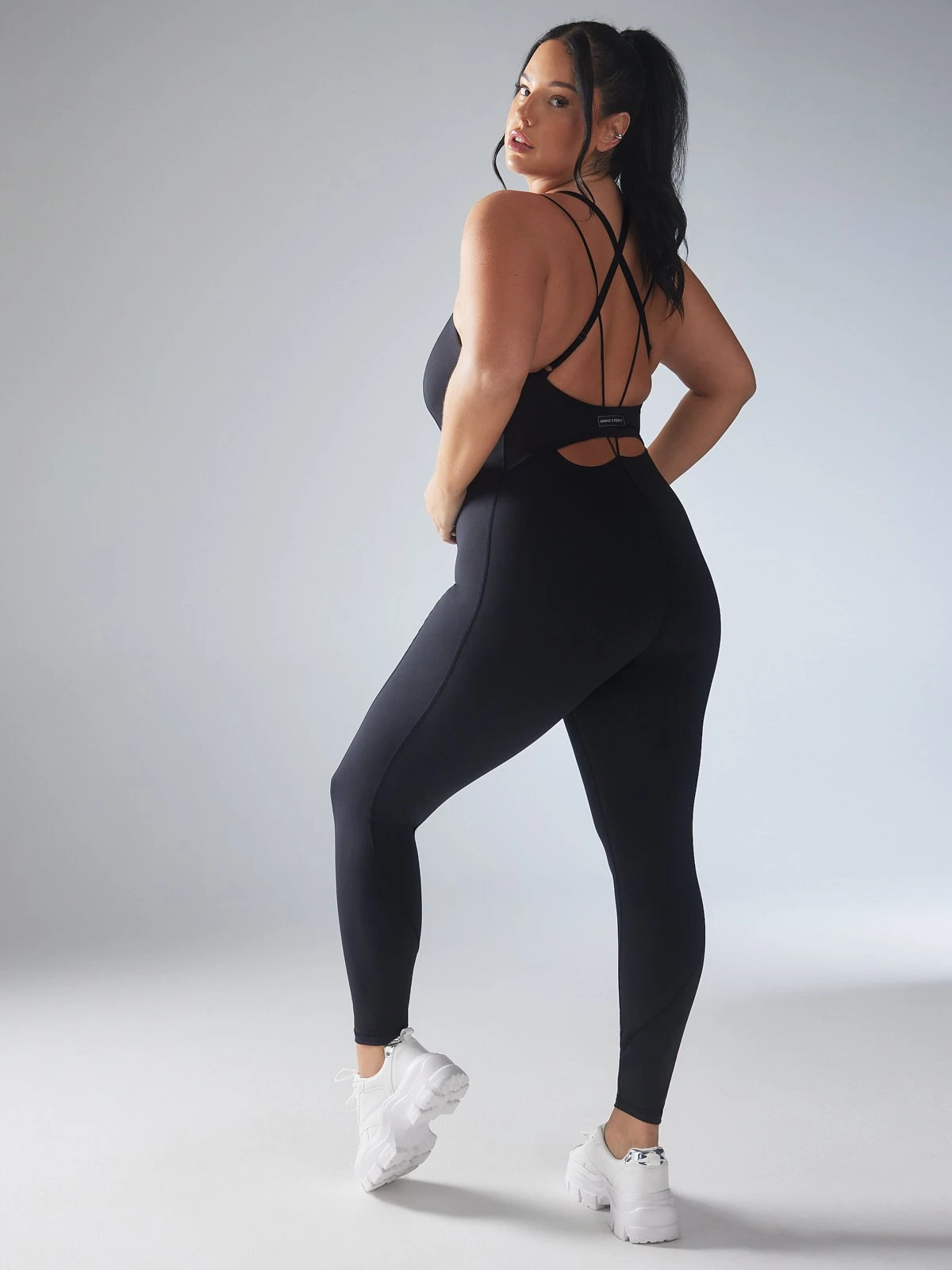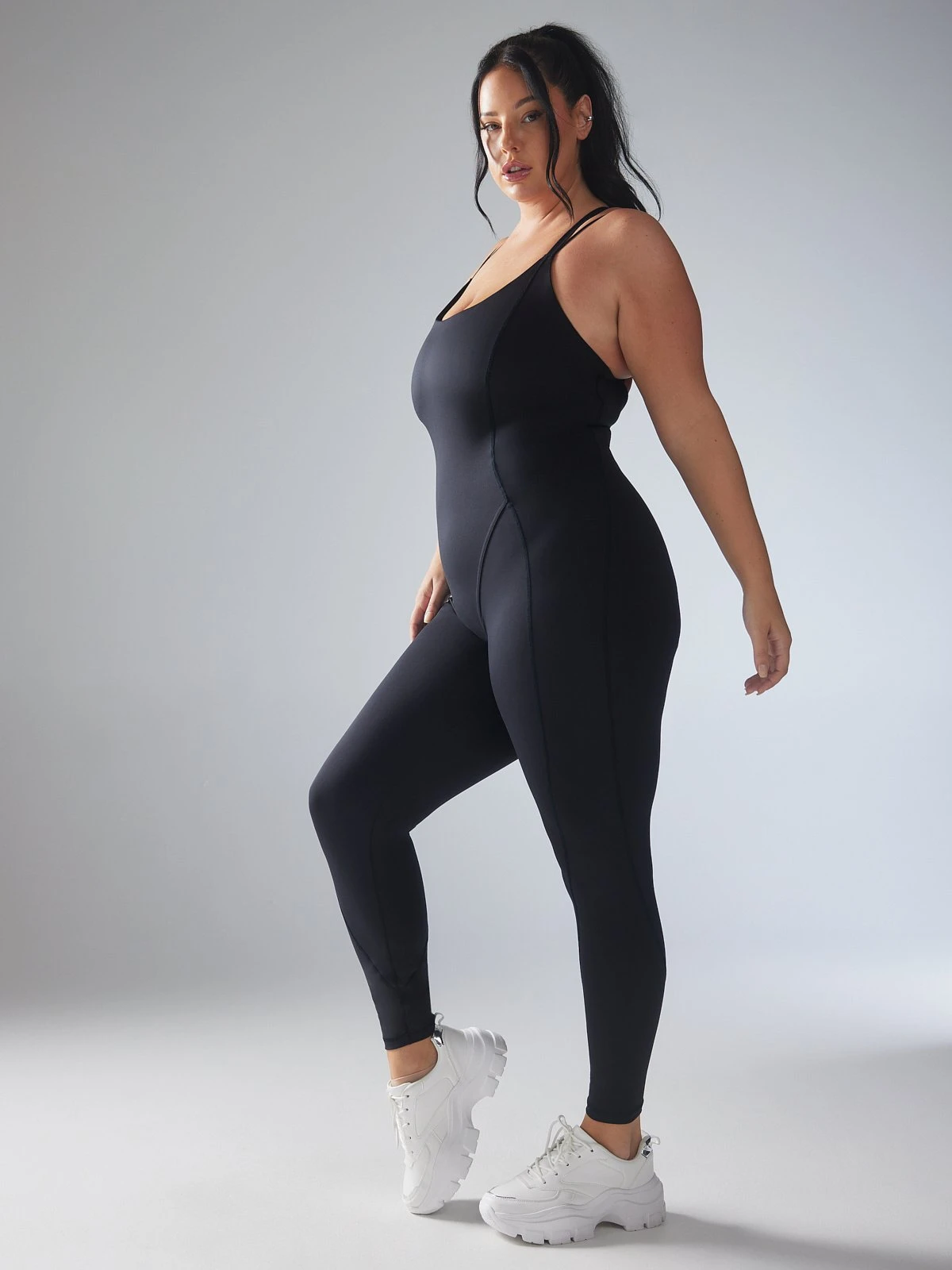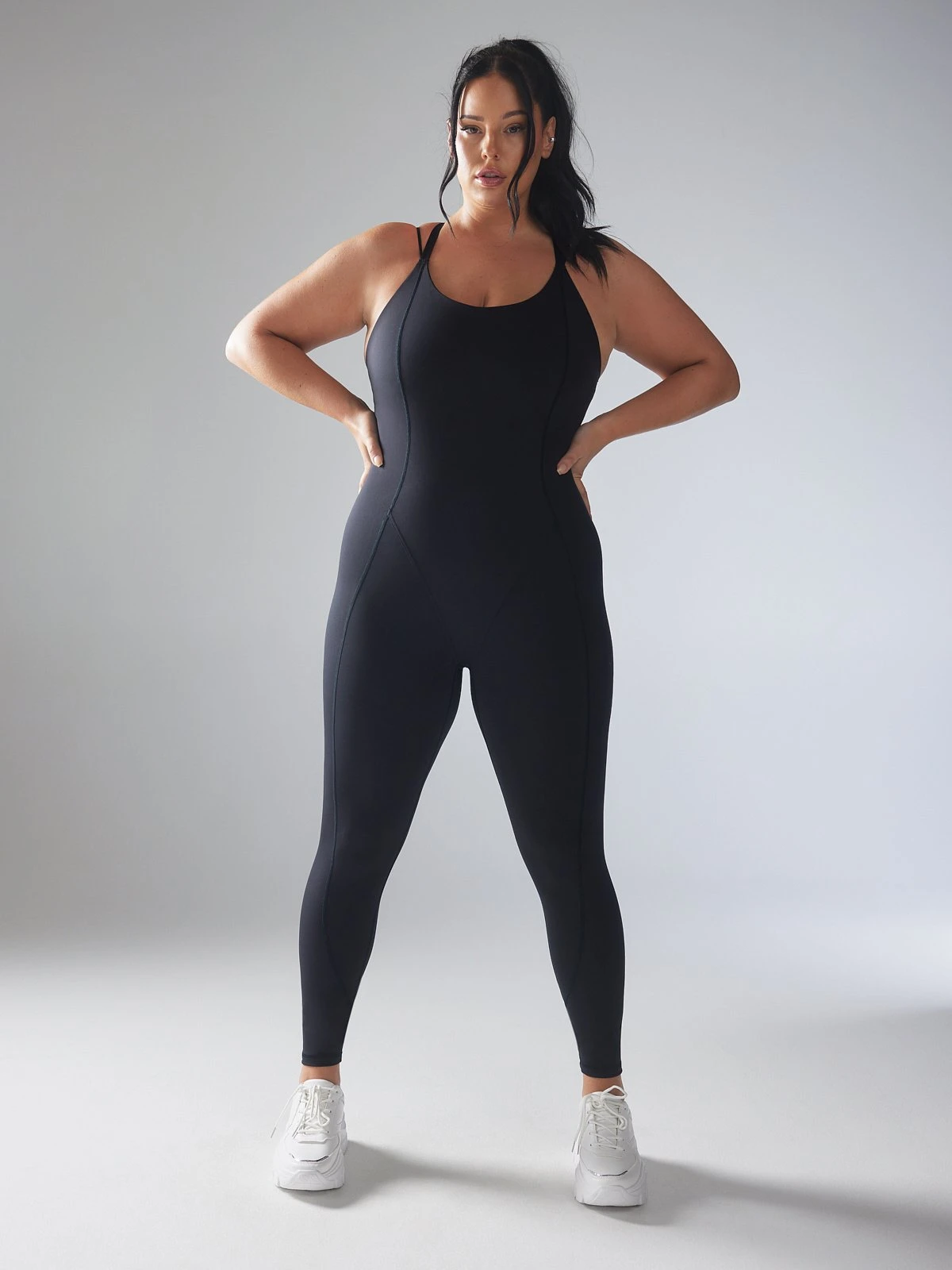 All about that silhouette! Our Curve Alert Jumpsuit features a built-in shelf bra, a smoothing panel for a snatched look, adjustable crisscross back straps, a back keyhole cutout, and flat-lock stitching that moves with your body.