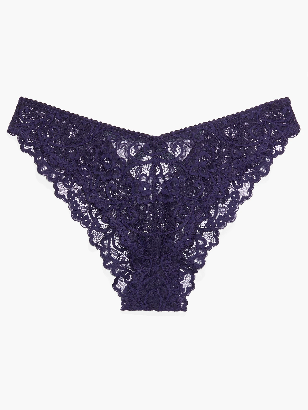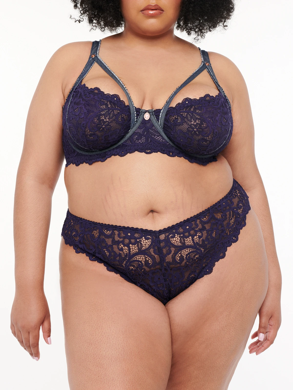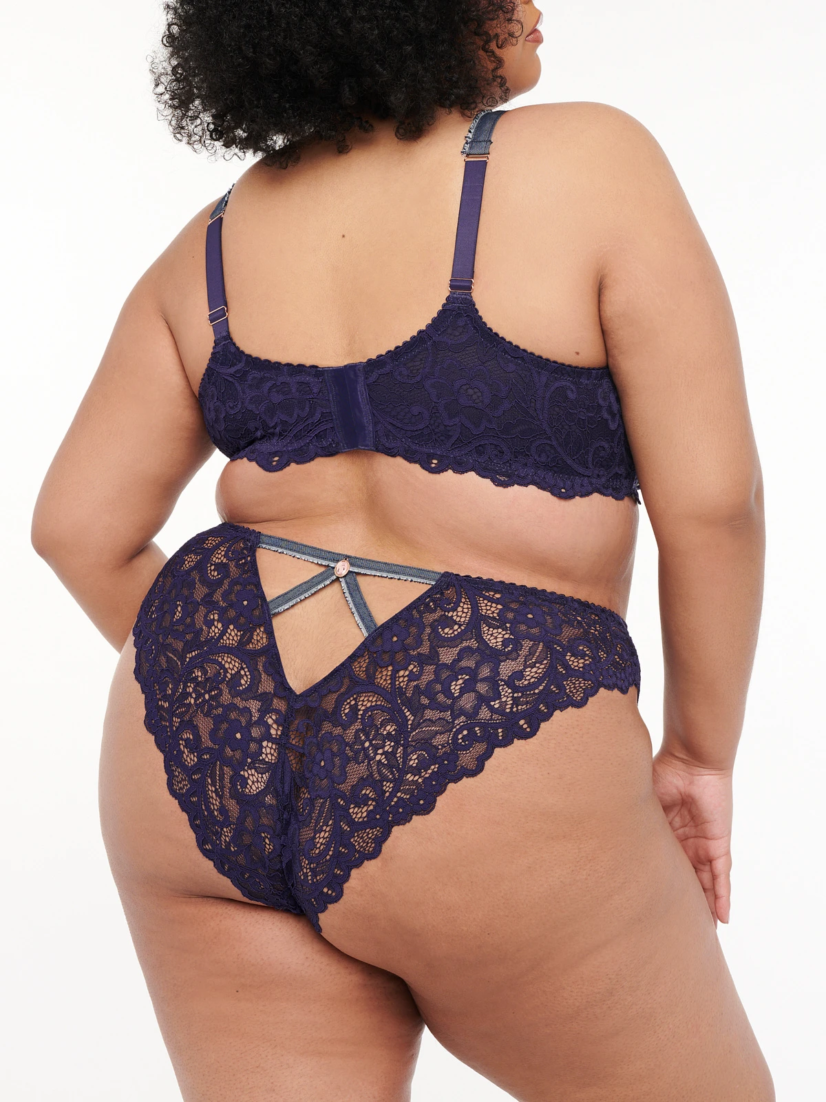 Where blue jean dreams come true, our Framed In Denim Lace Brazilian Panty features a strappy cutout in back with a cameo charm detail.