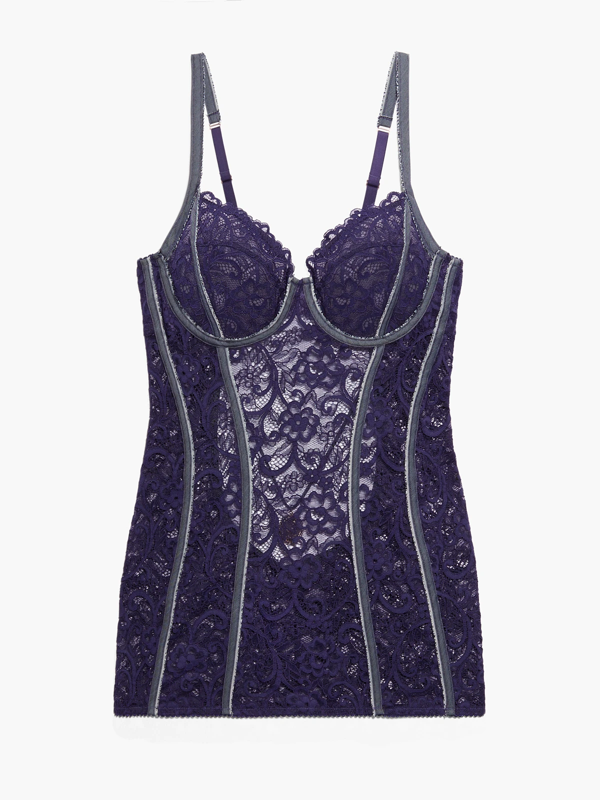 - Denim binding caged strapping at cups and front body