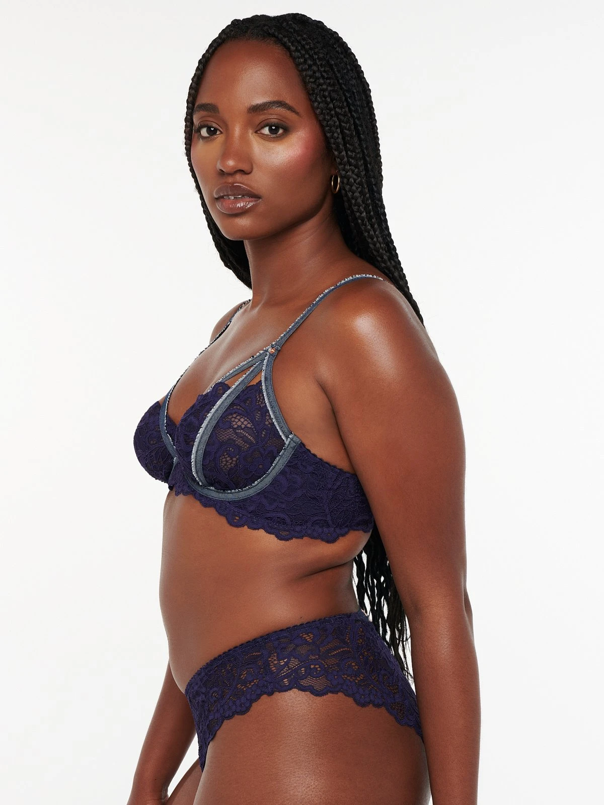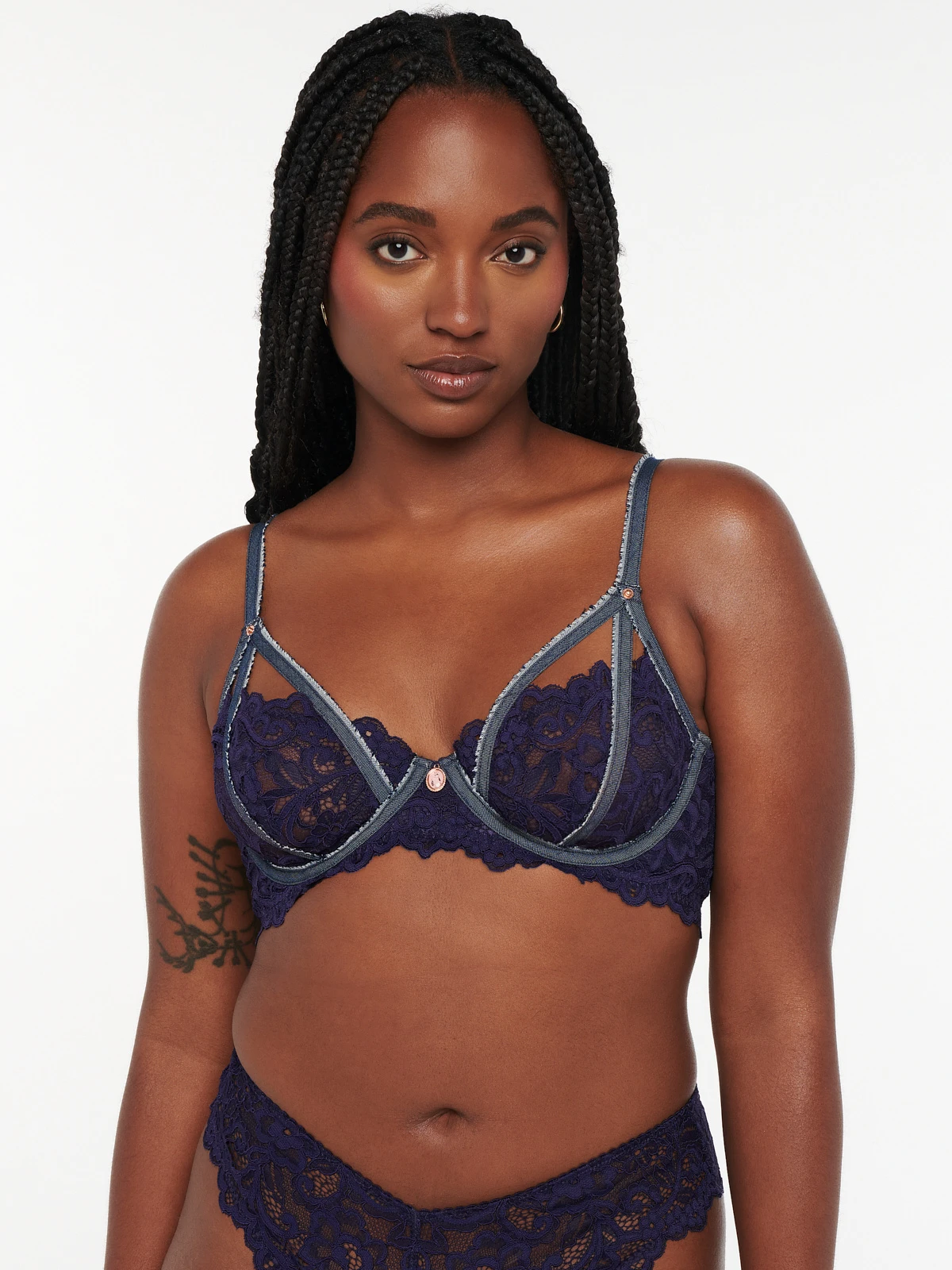 Where blue jean dreams come true, our Framed In Denim Unlined Demi Bra is made from a floral lace fabric and features a denim cage design, a logo cameo in front, and rose gold-tone hardware.