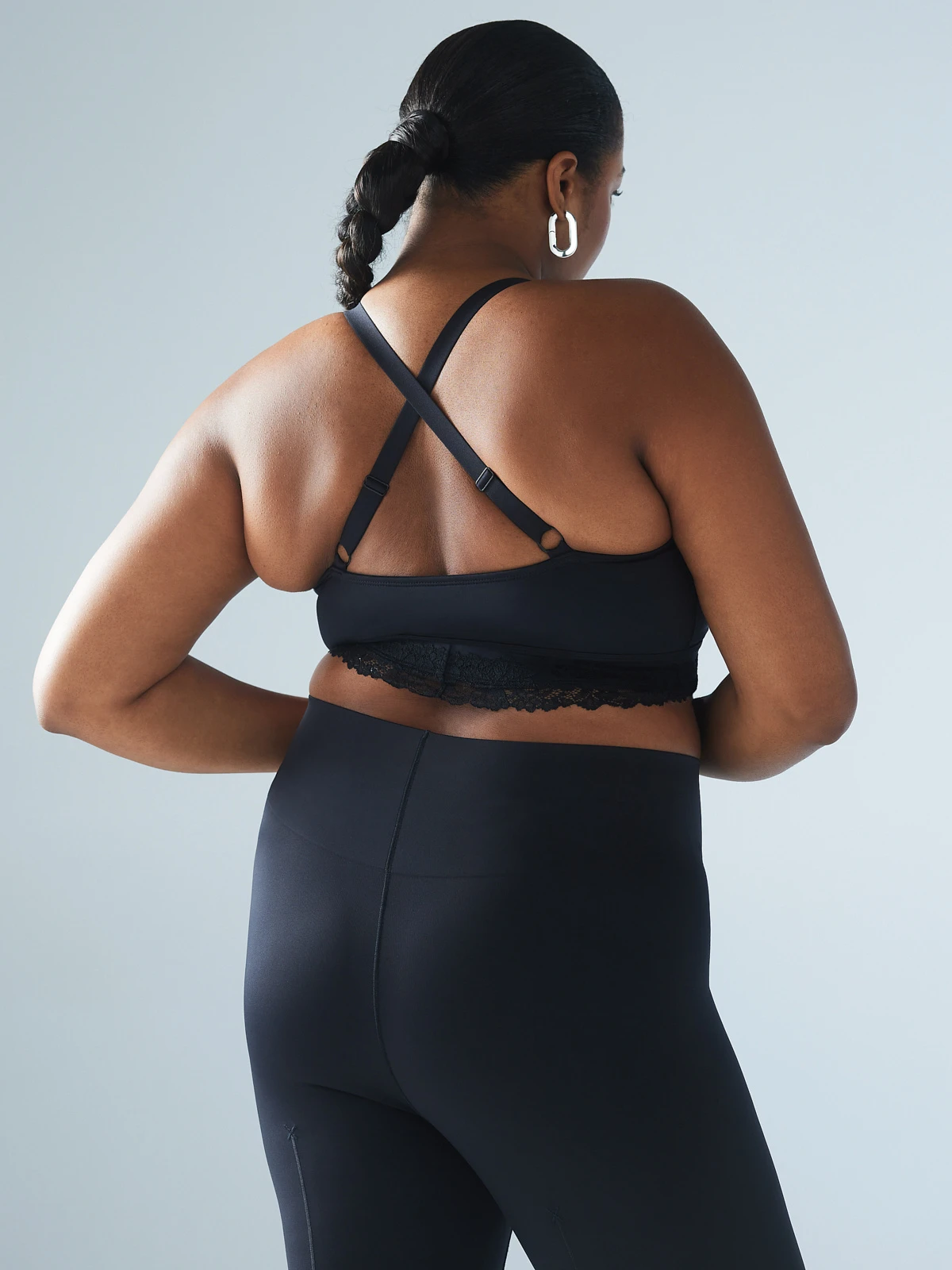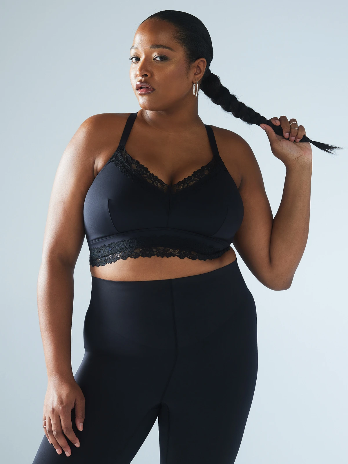 Because you always finish first. Our Lace Race Low-Impact Sports Bra features lace trim, a plush-back elastic waistband, and adjustable cross-back straps.