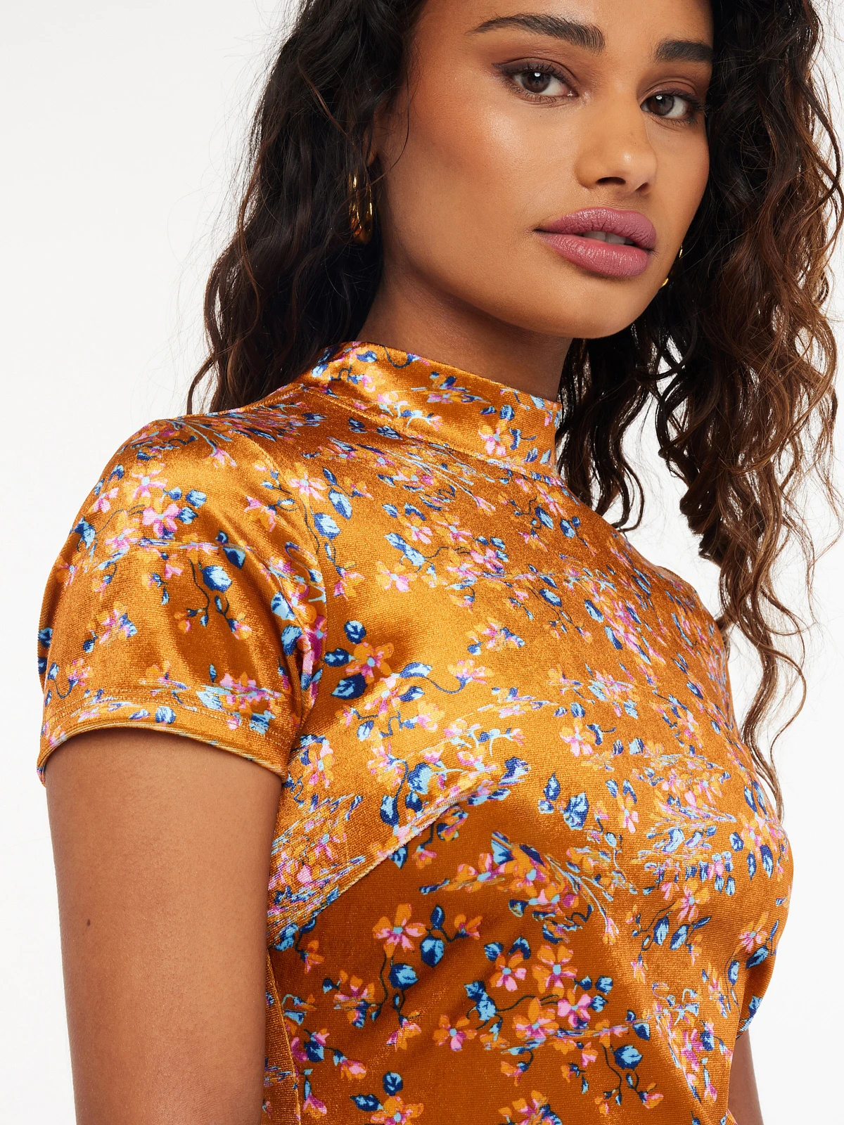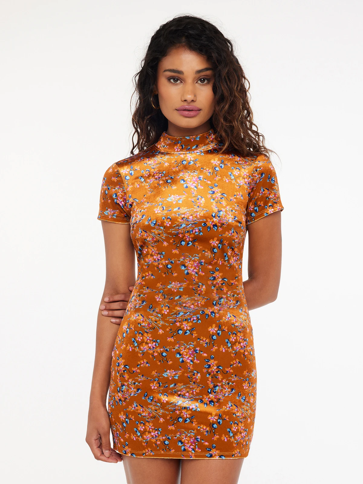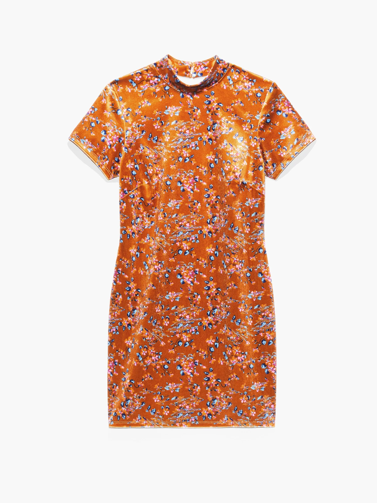 A regal vibe, our Psychedelic Velvet Slip features an allover custom print, cutout back, and high neckline.