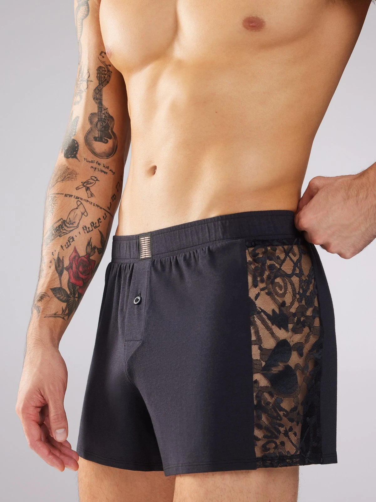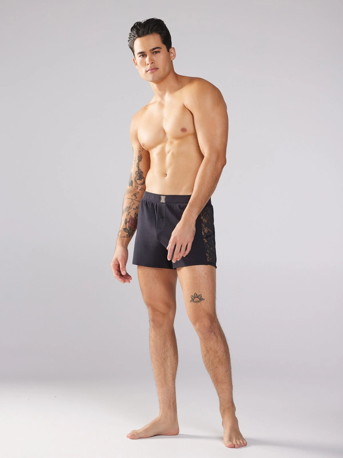 What’s a rebel without a little romance? Our Rebel Cherub Lace Boxers feature sheer lace panels at each side, a button fly, and an elasticized waist with a logo X at the center.