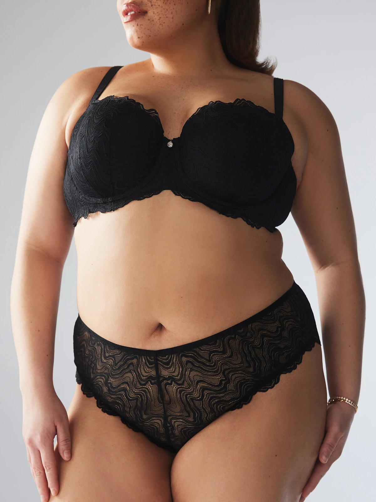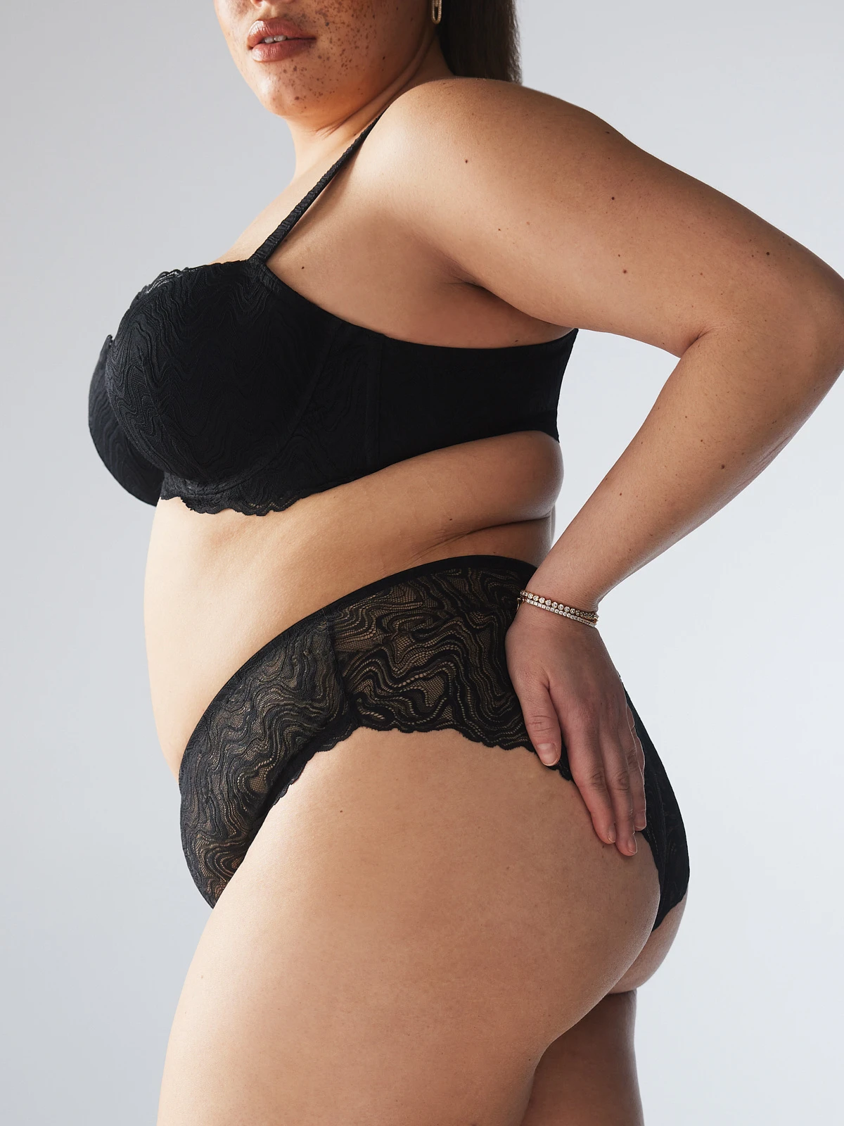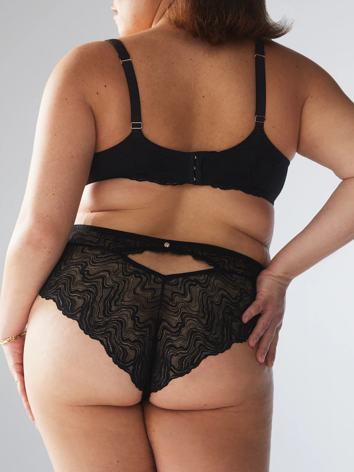 A new wave…our Ripple Effect Lace Cheeky Panty is made from a ripple-pattern lace and features a cutout in back with a faux pearl charm accent.