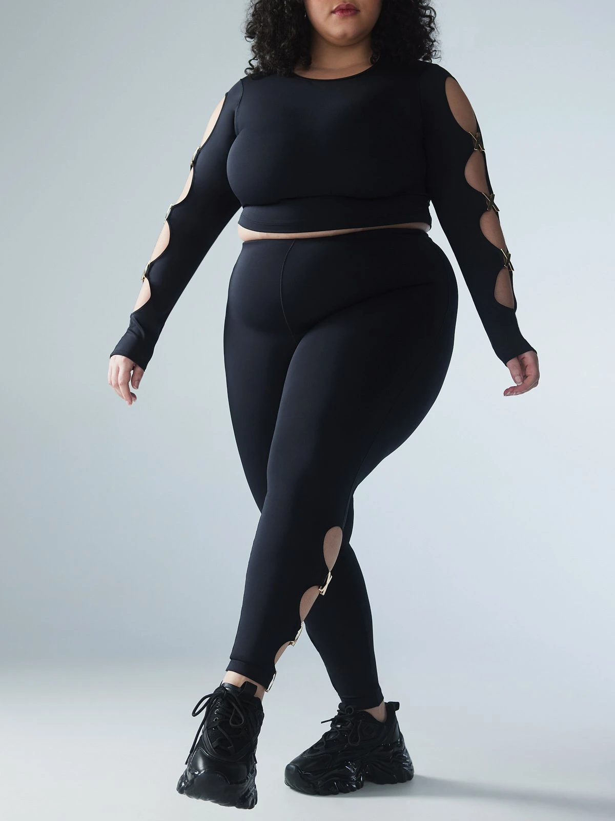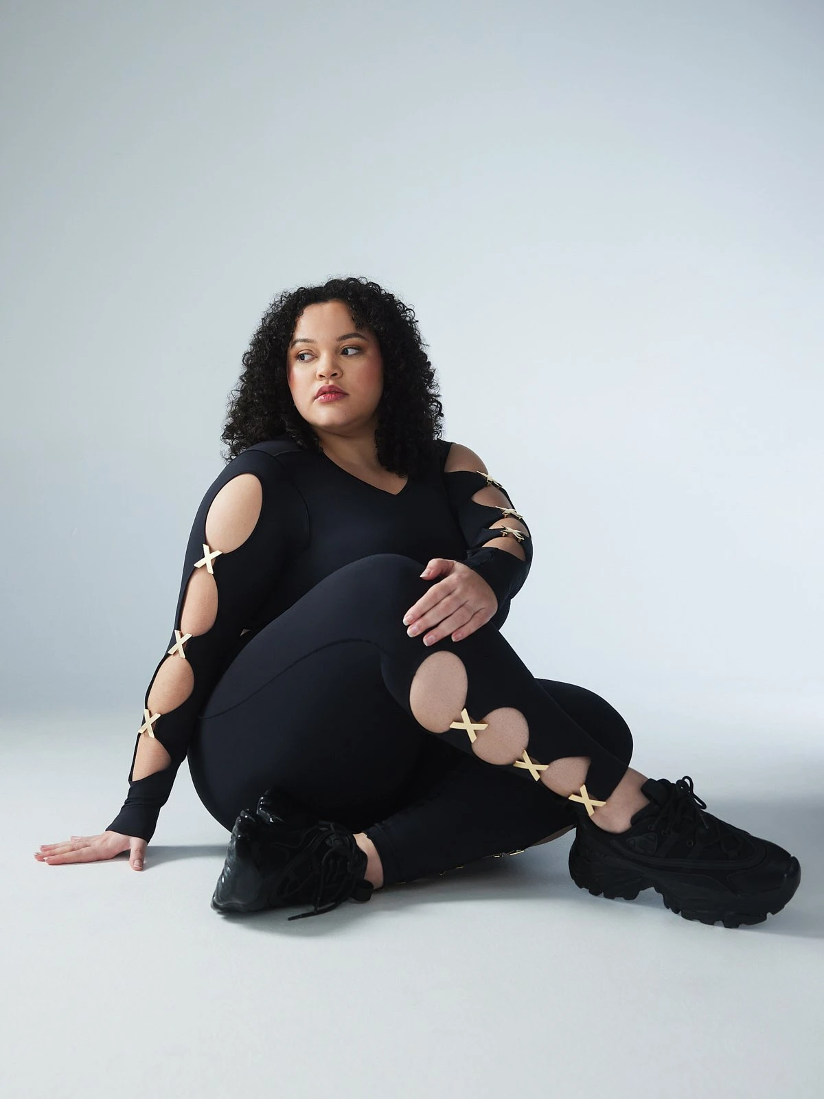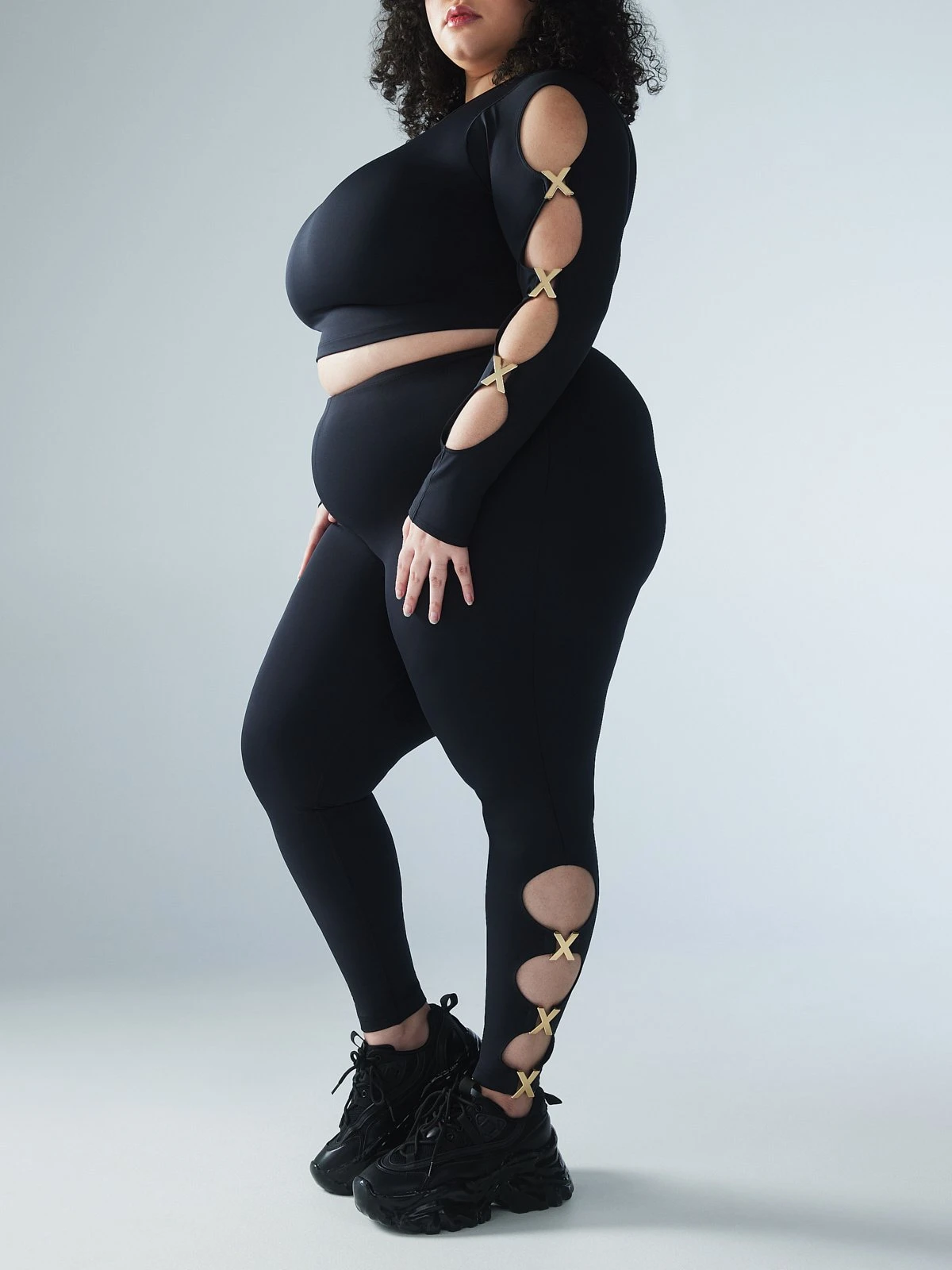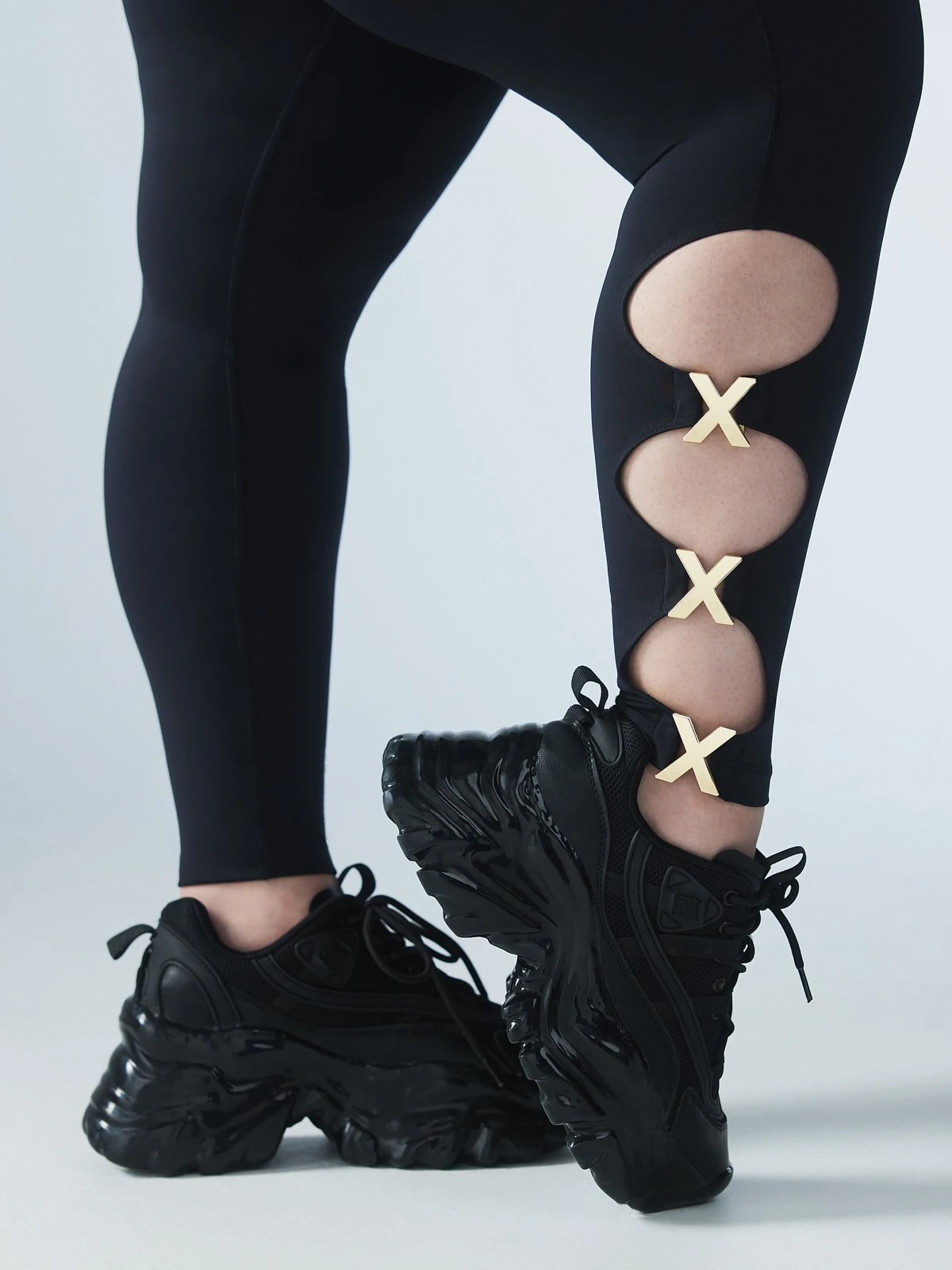 - Keyhole cutouts down outer leg side seams with gold-tone X hardware at center