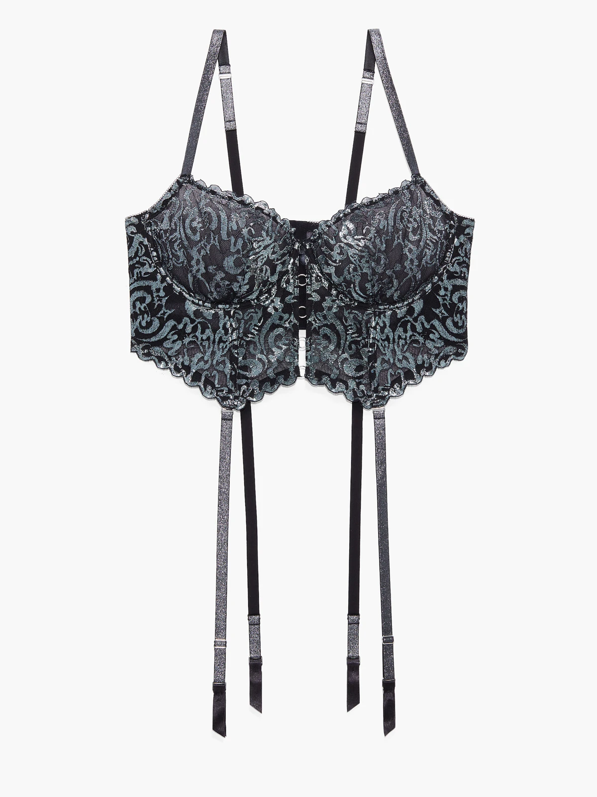 Suited down to the nines. Our Sharp Dresser Lace Bustier features custom metallic foiled lace, garter straps with silver-tone garter hardware, and a rigid tulle-lined front body.