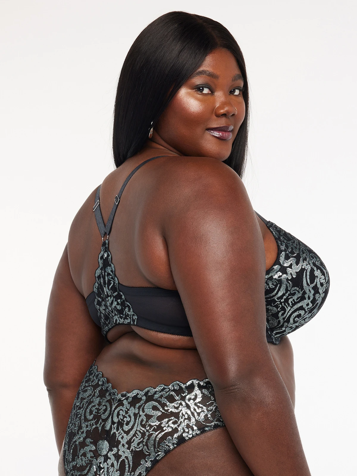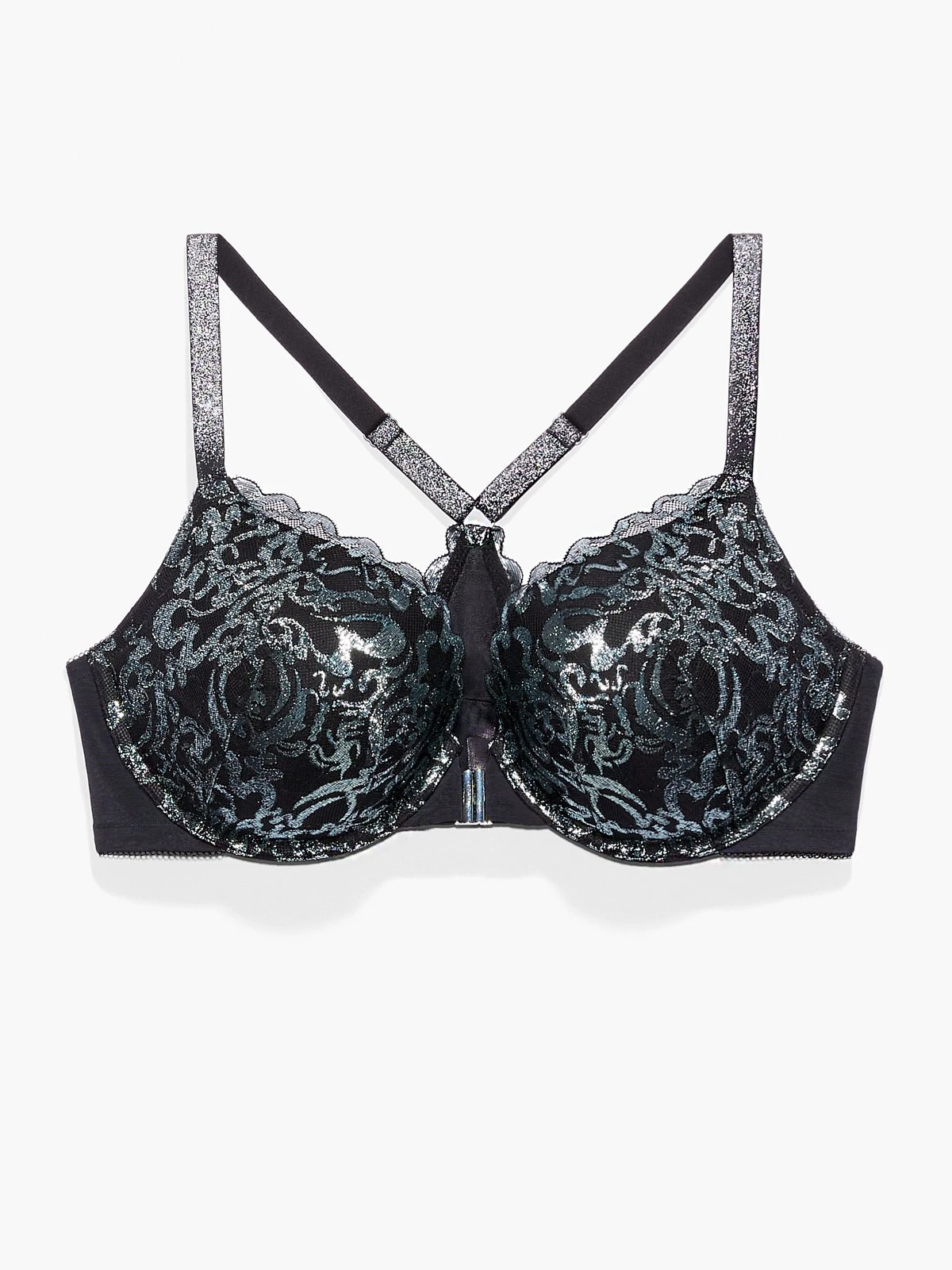 Suited down to the nines. Our Sharp Dresser Lace Push-Up Bra features a custom metallic foiled lace, a front clasp closure, and adjustable straps with silver-tone hardware.