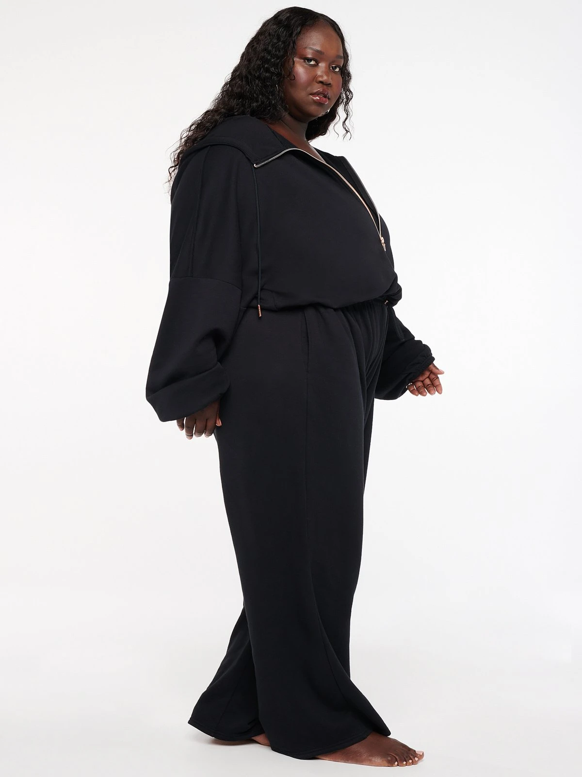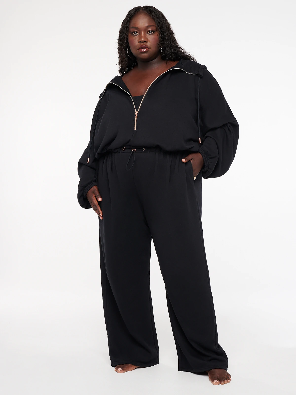 Never miss a beat in our fleece Xssential Cinched Hooded Onesie, featuring a wide elastic waistband, a drawstring hood, a rose gold zipper in front, and a cinched sleeve elastic hem.