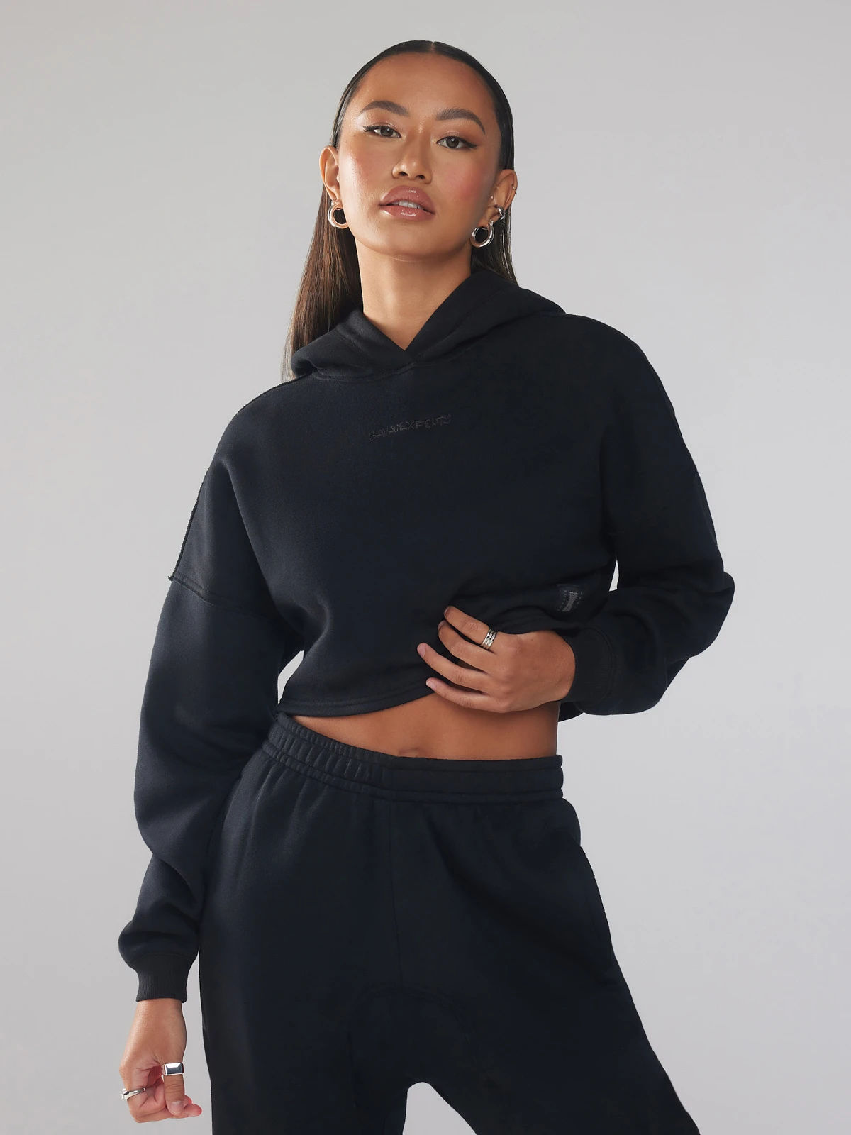 Never miss a beat in our fleece Xssential Crop Hoodie with Logo. This piece features a drop shoulder seam, raw edge details, and logo detail on the front and back.